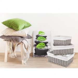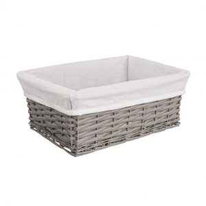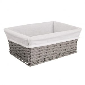 Prútený košík v šedej farbe je potiahnutý bavlnenou látkou. Môžete …