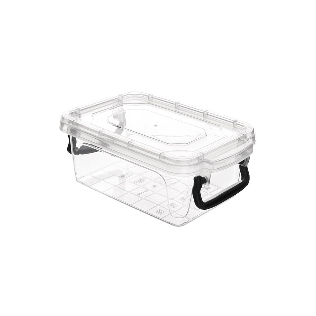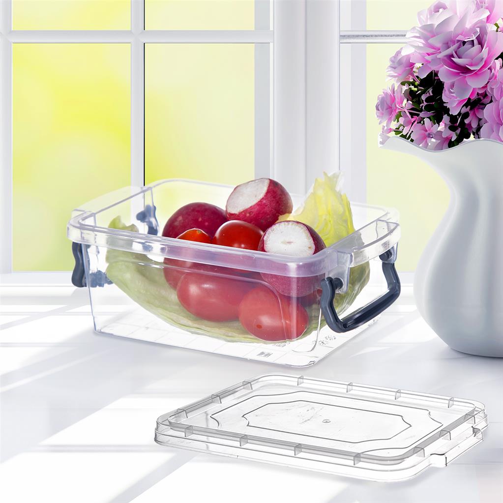 Obdĺžnikový box na uskladnenie rôznych druhov potravín. Má zatváranie na kovové klipy, vďaka čomu nedôjde k samovoľnému otvoreniu. Materiál: plast. Rozmery: objem 0,3 l, 13×8,5×5 cm.