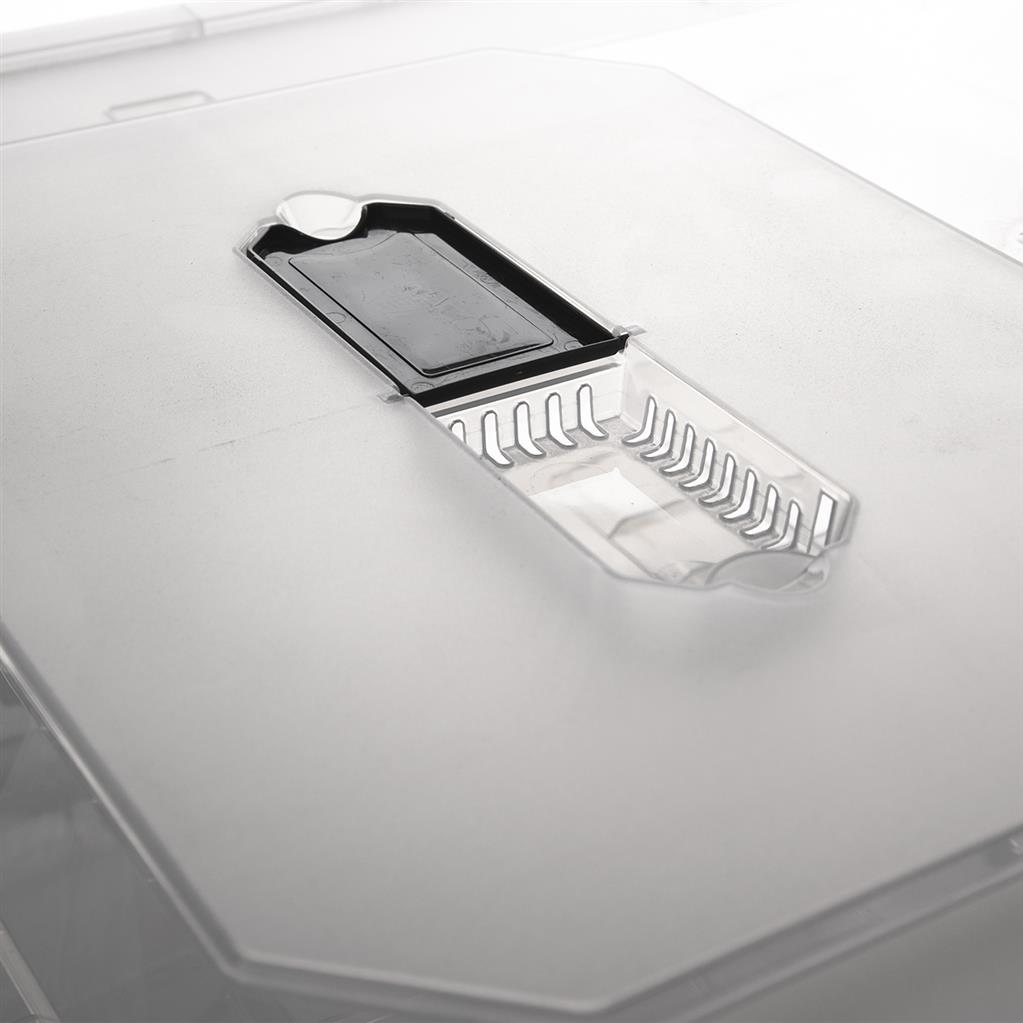 Odporučiť Praktický obdĺžnikový box bude mať využitie v každej domácnosti. Má dva pevné klipy, vďaka ktorým nedôjde k samovoľnému otvoreniu. Využijete ho na uloženie hračiek alebo kancelárskych pomôcok. Box taktiež disponuje kolieskami pre ľahšiu manipuláci a prenášanie. Vo viečku sa tiež nachádza uzatvárateľný odvetrávací ventil. Materiál: plast. Rozmery: objem 55 l, 80x60x20 cm.
