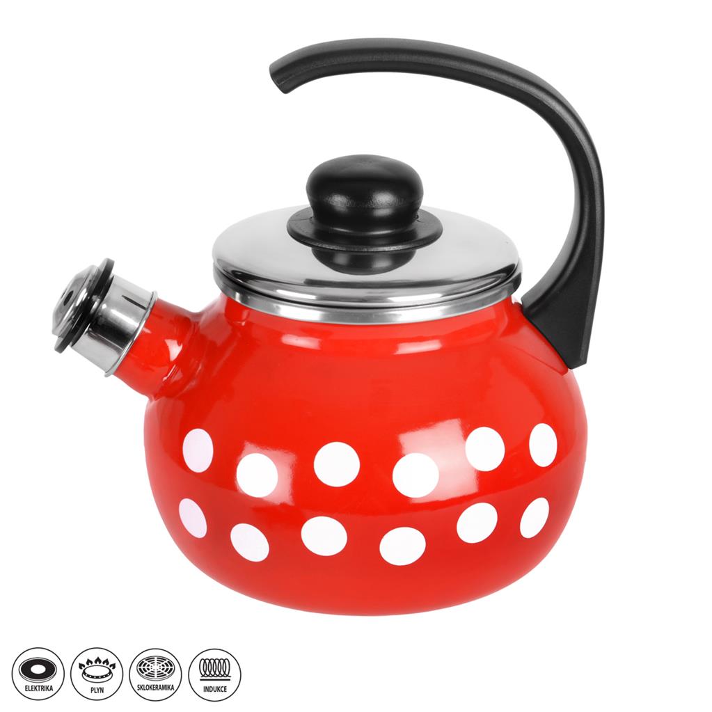 Praktický čajník v retro prevedení, je vhodný na zohriatie vody na kávu alebo čaj. Má píšťalku, ktorá Vám ohlási vriacu vodu. Je vhodný na všetky typy spotrebičov. Materiál: smalt, nerez, plast. Rozmery: objem 1,75 l, priemer cca 17 cm, celková výška 21 cm.