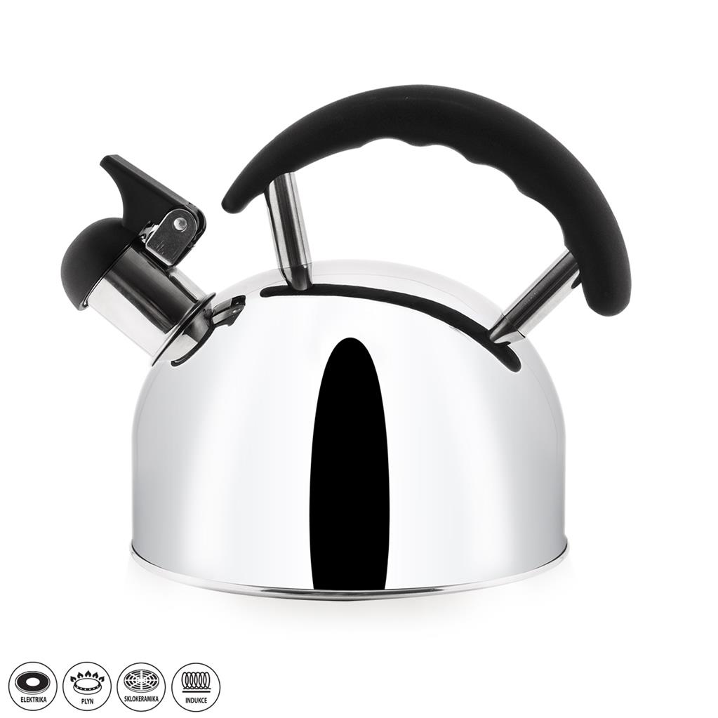 Moderný čajník s píšťalkou na zohriatie vody na čaj i kávu.