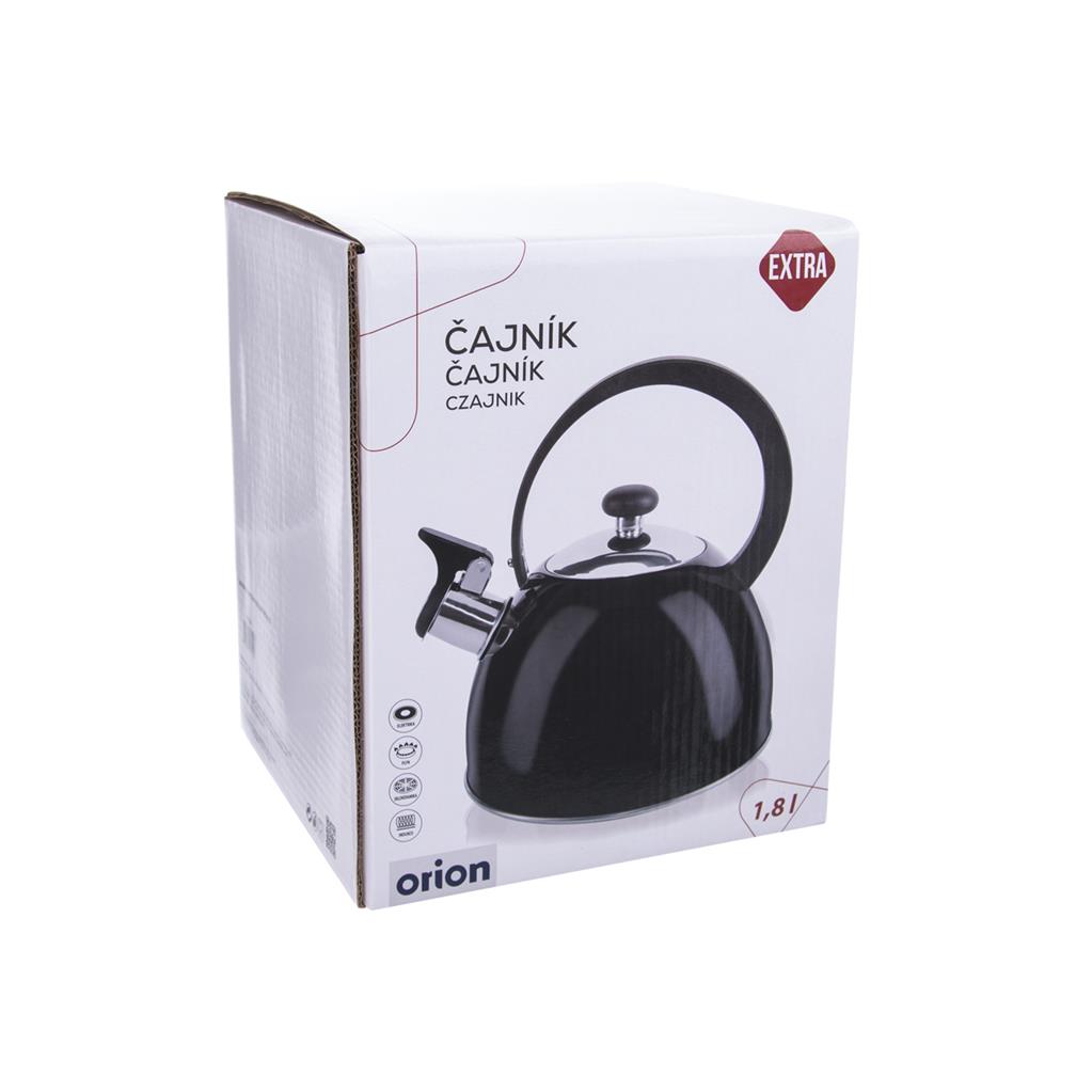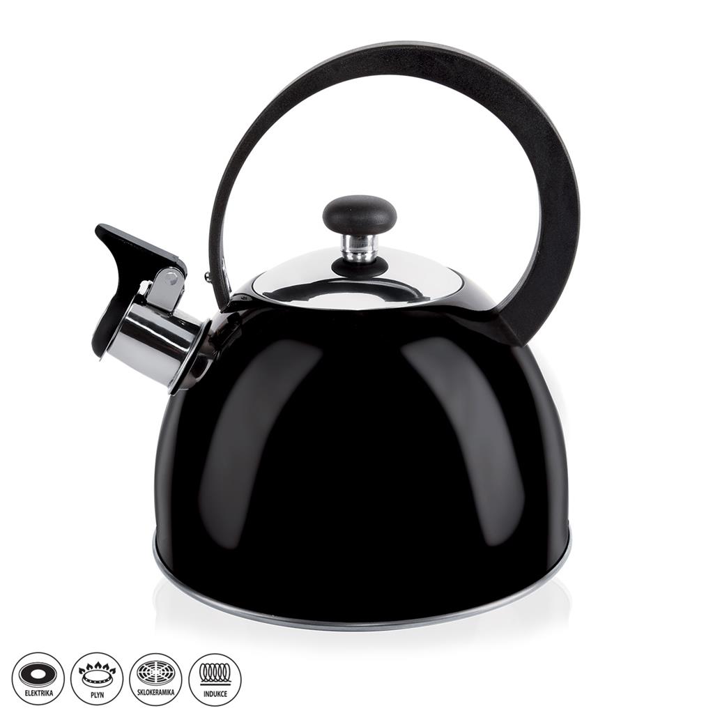 Moderný čajník v luxusnej čiernej farbe, je vhodný na zohriatie vody na kávu alebo čaj. Hodí sa do každej modernej kuchyne. Má píšťalku, ktorá Vám ohlási vriacu vodu. Je vhodný na všetky typy spotrebičov. Aby nedochádzalo k jeho prehrievaniu, je nutné ho plniť minimálne do polovice. Materiál: nerez. Rozmery: objem 1,8 l, priemer cca 18,5 cm, celková výška 21 cm.