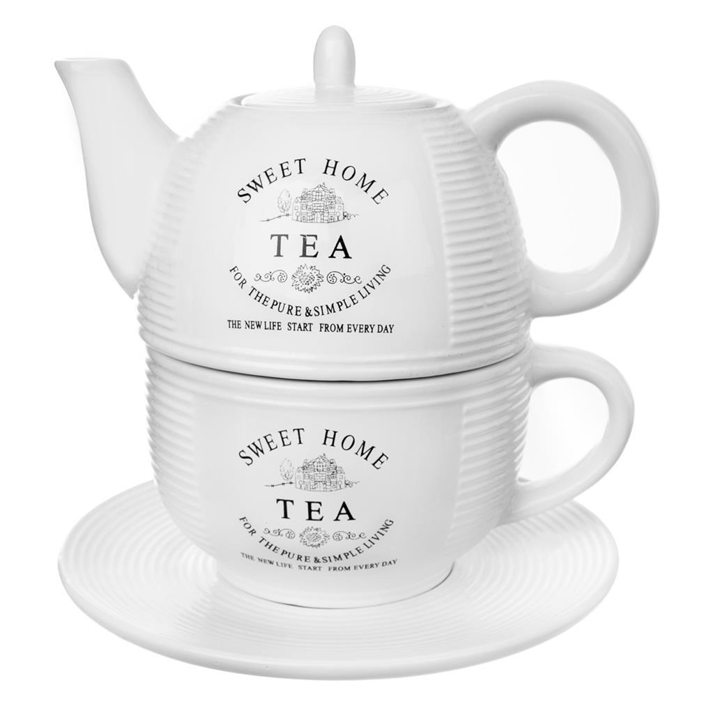 Keramická čajová súprava SWEET HOME je praktická a spratná, pretože hrnček a kanvička zapadajú do seba a nezaberú veľa miesta. K súprave patrí aj praktická podšálka.