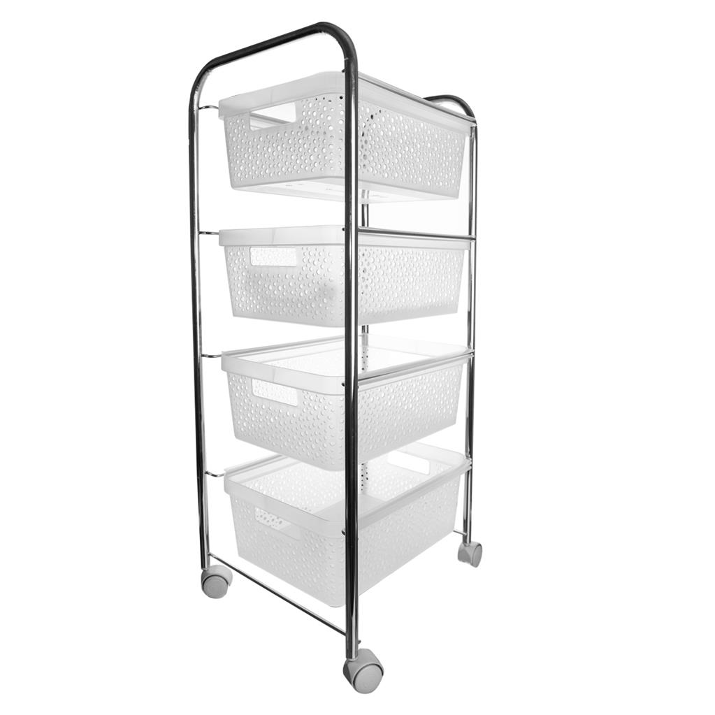 Multifunkčný pomocník vo forme pojazdného regálu so štyrmi poschodiami, je praktický a navyše elegantný. Vďaka kolieskam zabezpečuje ľahkú manipuláciu. Výborne sa hodí do kúpeľne, kuchyne, predsiene či komory, poskytuje dostatok úložného priestoru v podobe štyroch zásuviek. Materiál: pochrómovaný kov, kvalitný plast. Rozmery: 34x39x87 cm.