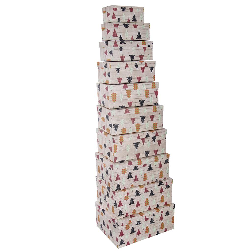 Chcete originálne zabaliť darčeky, tak nestrácajte čas baliacim papierom. Darčekové krabičky sú veľmi praktické, a vďaka rôznym veľkostiam do nich zabalíte čokoľvek. Dokonca majú krásny vianočný motív. Sada obsahuje 10 ks krabičiek. Materiál :papier. Rozmery: 21x11x8 cm, 23x13x9 cm, 25x15x10 cm,27x17x11 cm, 29x19x12 cm, 31x21x13 cm, 33x23x14 cm, 35x25x15 cm, 37x27x16 cm, 39x29x17 cm.