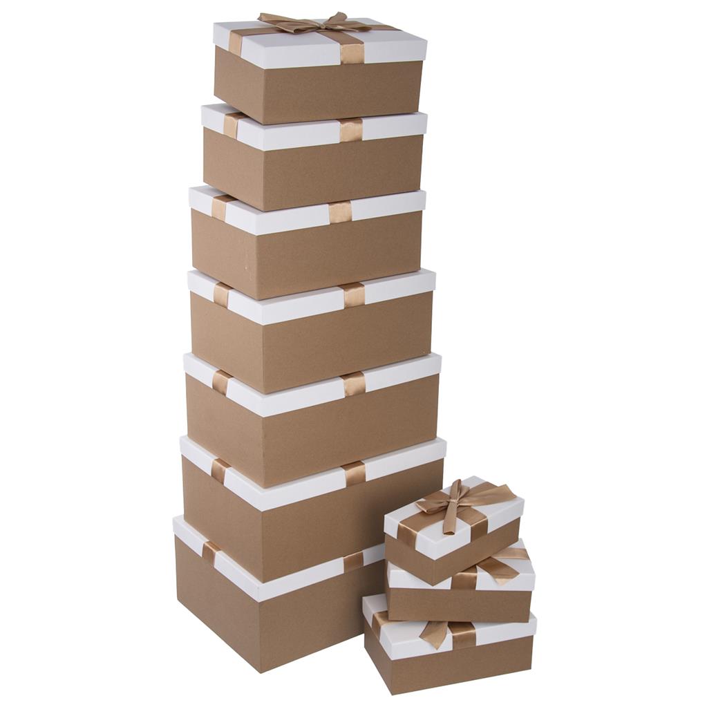 Chcete originálne zabaliť darčeky, tak nestrácajte čas baliacim papierom. Darčekové krabičky sú veľmi praktické, a vďaka rôznym veľkostiam do nich zabalíte čokoľvek. Majú krásnu zlato bielu farbu so stuhou. Sada obsahuje 10 ks krabičiek. Materiál :papier. Rozmery: 21x11x8 cm, 23x13x9 cm, 25x15x10 cm,27x17x11 cm, 29x19x12 cm, 31x21x13 cm, 33x23x14 cm, 35x25x15 cm, 37x27x16 cm, 39x29x17 cm.