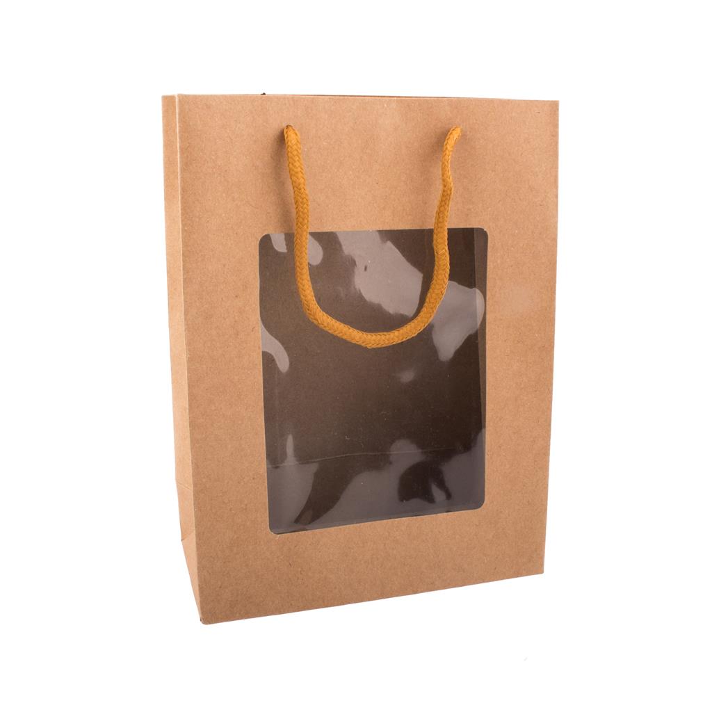 Štýlová darčeková taška je vhodná na prezentáciu Vašich výrobkov, pretože vďaka priehľadnému okienku hneď vidno, o aké produkty sa jedná. Materiál: papier, plast. Rozmery: 14x7x18 cm.