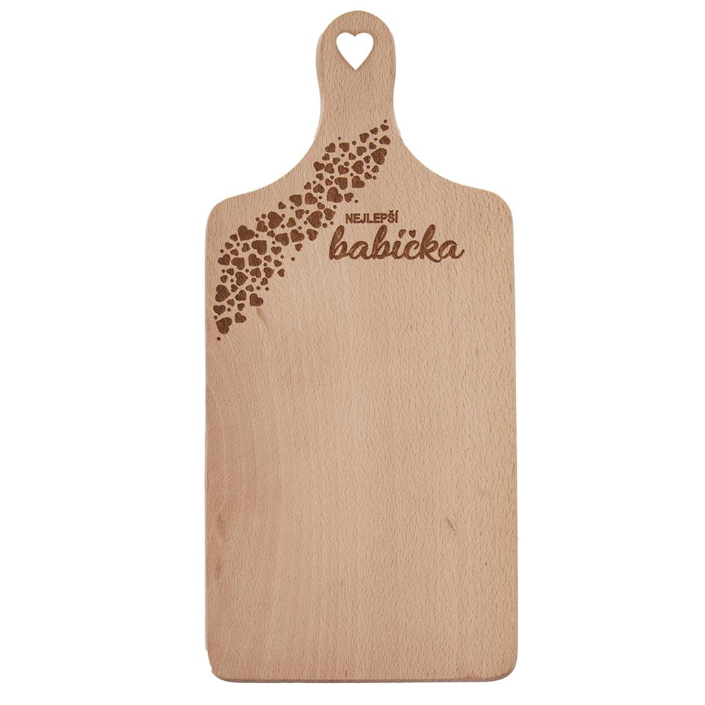 Rustikálna doska – lopárik na krájanie či servírovanie. S praktickou rukoväťou a s vypaľovaným dekorom NEJLEPŠÍ babička. Pohodlne a štýlovo na nej naservírujete raňajky i večere. Využiteľná je pri kuchynských činnostiach ako krájanie, či príprava na grilovanie. Výnimočne jednoduchá údržba, stačí pretrieť vlhkou handričkou a doska je opäť pripravená na používanie. Materiál: drevo. Rozmery: 30×14 cm.