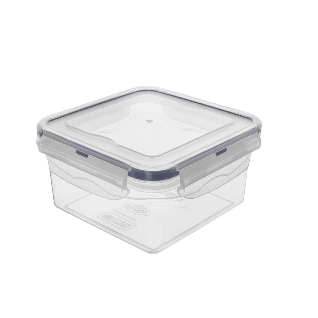 Plastová hranatá dóza s gumovým tesnením vo viečku a klipmy pre pevné uzatvorenie. Praktický pomocník zabráni rozliatiu tekutých potravín. Vhodná do chladničky (-10 °C až +95 °C), mikrovlnnej rúry (bez viečka) aj umývačky riadu. Materiál: plast. Rozmery: objem 0,68 l, 13,5×13,5×7 cm.
