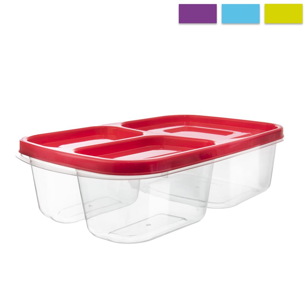 Dóza delená na tri sekcie skvelo uchová potraviny v chladničke i mrazničke (do -25 °C), je skvelá na prenášanie potravín, v dóze je možné ohrievať pokrm aj v mikrovlnnej rúre, sú vhodné aj do umývačky na riad (do +95 °C). K výberu ponúkame rôzne farebné prevedenie viečok. Materiál: plast. Rozmery: objem 2,2 l, 29×17,5×8 cm.