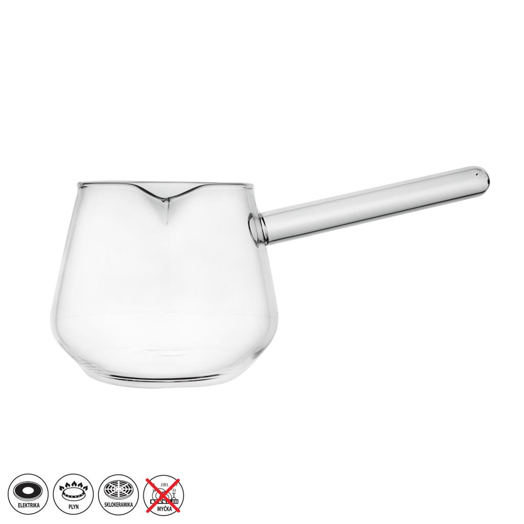 Sklenená džezva s rukoväťou je výborným pomocníkom na príravu kávy. Má rozšírený vrchný “golier”, ktorý bráni vykypeniu. Výlevka Vám uľahčí pohodlnejšie nalievanie. Nie je vhodná do umývačky riadu.