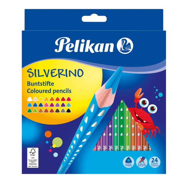 Farbičky Pelikan Silverino, trojhranné, tenké, 24 ks. Priemer tuhy 4 mm. Vyrobené z FSC dreva. Po celej dĺžke obsahujú strieborné ryhy pre lepšie uchopenie. Farba: mix, počet: 24 kusov.