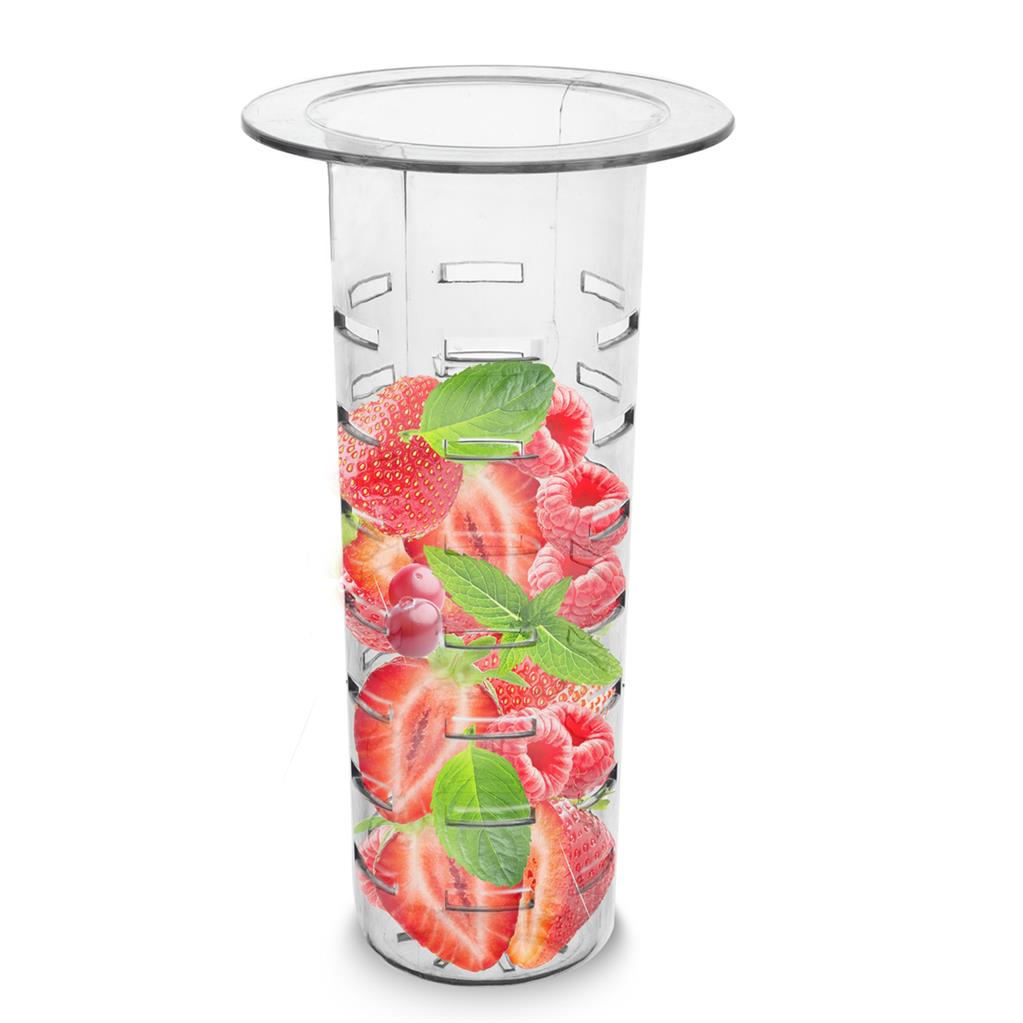 Špeciálna vychytávka – filter do zásobníka na nápoje, ktorý umožní ochutiť váš drink, a zároveň ho uchová čírym. Do zásobníka vložte nakrájané citrusové ovocie, bobuľovité ovocie a podobne. Cez otvory filtra sa uvoľní šťava do nádoby s nápojom a príjemne ho osvieži, pevné časti sa uchovajú v zásobníku. Tip: ak do zásobníka vložíte napr. čerstvú mätu alebo medovku, aróma a príchuť byliniek sa v nápoji prejaví, lístky však ostanú pekne vo filtri. Materiál: kvalitný plast. Materiál: kvalitný plast. Rozmery: priemer 7,5/14 cm, výška 23 cm. Je vhodný pre fľaše s kohútikom 143739, 143740.