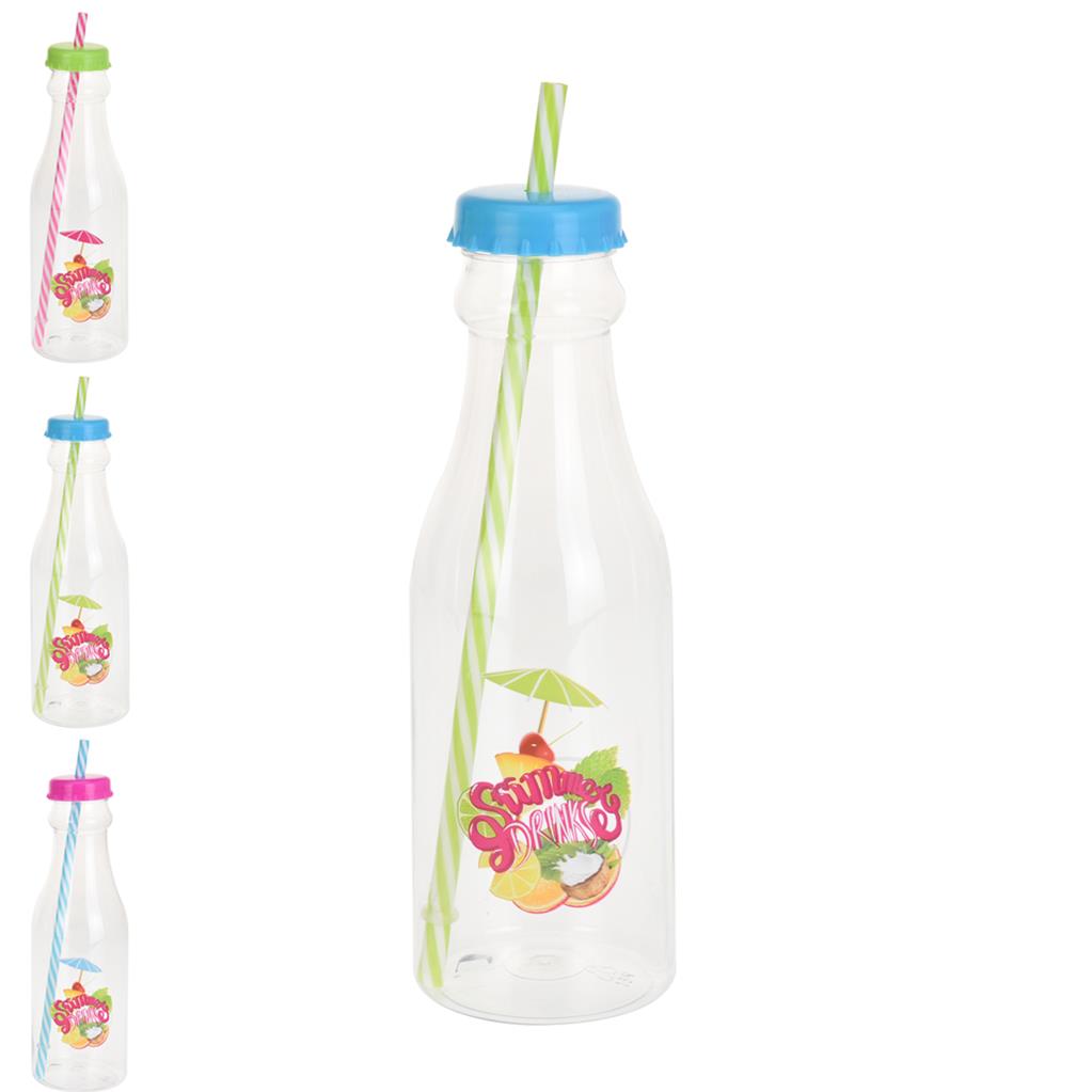 Plastová fľaša s viečkom a slamkou poslúži, ak si chcete ustrážiť svoj pitný režim. Majte ju vždy poruke plnú svojho obľúbeného nápoja. Využijete ju i na miešané drinky – či už alkoholické alebo bez alkoholu, s ovocím, bylinkami aj ľadom. Materiál: plast. Rôzne farby. Rozmery: objem 0,65 l, priemer 7 cm, výška 23/26 cm.