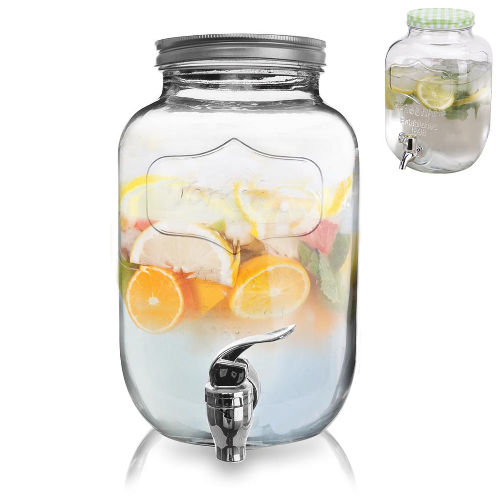 Klasicky tvarovaná sklenená fľaša s čapovacím kohútikom a plechovým vekom na závit, poslúži v každej domácnosti pri podávaní nápojov rôzneho druhu. Jej všestranné využitie ju predurčuje na servírovanie ovocných štiav, rôznych miešaných nápojov a studených čajov.