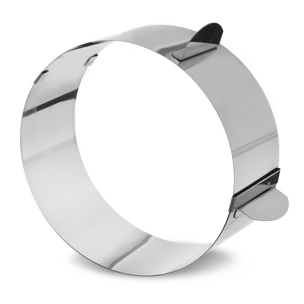 Posuvná forma na pečenie torty. Vďaka tejto forme môžete piecť torty rôznych veľkostí a tvarov. Materiál: nerez. Rozmery: pr. 15-30 cm,v. 7,5 cm.
