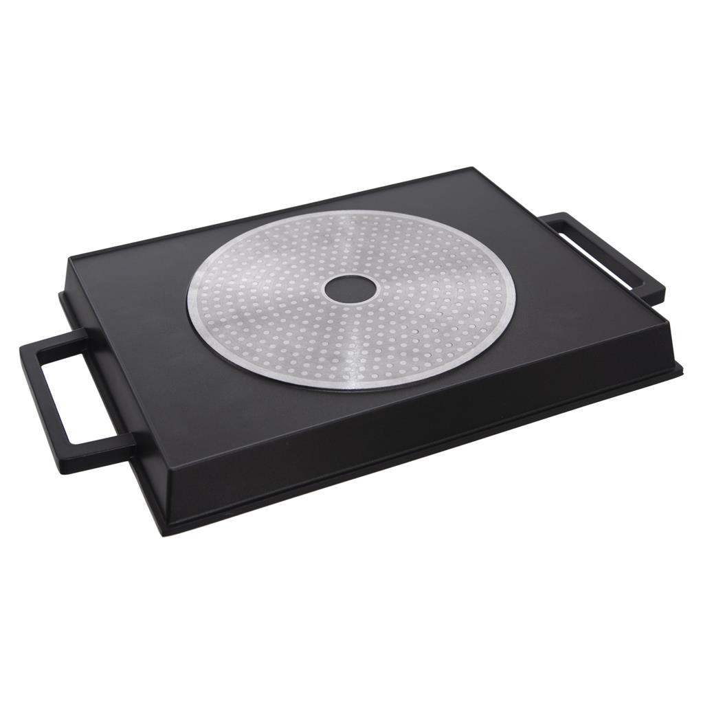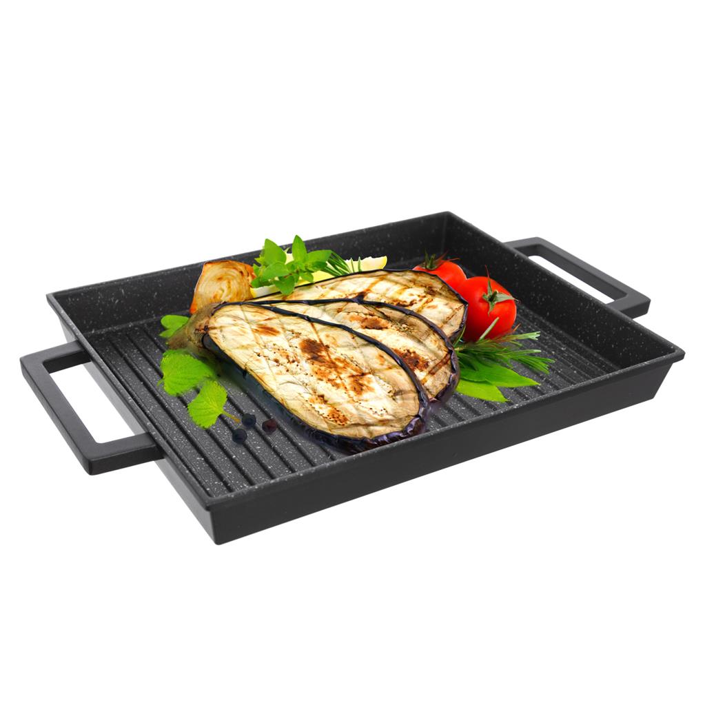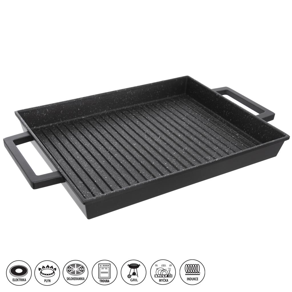Odporučiť Pripravte si výborné steaky, zeleninu, volské oká s minimálnou potrebou tuku na nepriľnavom povrchu na grilovacej doske s dvomi ušami a vrúbkovaným povrchom. Na doske je možné grilovať mäso, zeleninu, ryby, údeniny, vajíčka a iné pokrmy. Doska je vhodná aj do umývačky riadu. Rovnako je vhodná na všetky typy spotrebičov, vrátane indukcie. Vhodná aj do rúry a na opekanie. Odporúčame vám pri manipulácií použiť kuchynské chňapky. Dosku nevkladajte priamo do ohňa, pretože by mohlo prísť k deformovaniu a v takom prípade nemôže byť doska predmetom reklamácie. Dosku umiestňujte nad plamene poprípade žeravé uhlie na grile a podobne. Materiál: hliník s vynikajúcim nepriľnavým povrchom PFLUON GRANIT a profilovaným dnom. Rozmery sú 35/43x27x4cm.