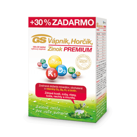 Výživový doplnok GS Vápnik, horčík, zinok Prémium obsahuje zosilnené množstvo minerálov obohatené o vitamíny D3, B6, K1 a biotín. Určený pre zdravé kosti, vlasy,nechty, kožu a pre dobrú imunitu. Silná dávka 400 mg vápnika pre zdravé a silné kosti a zuby.