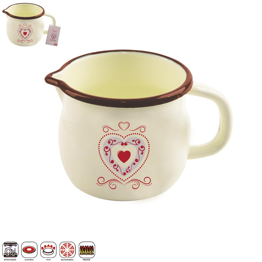 Hrnček smaltovaný s dekórom TONČA s výlevkou.
