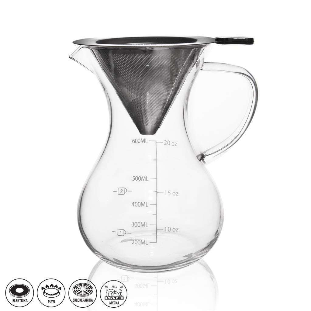 Ak máte radi prekvapkávanú kávu, pomocou kanvice s odmerkou a sitkom si u veľmi jednoducho pripravíte. Intenzitu voňavého nápoja si regulujete sami množstvom mletej kávy, ktorú vsypete do sitka. Materiál: borosilikátové sklo (odolné teplotám od -10 °C do +210 °C), nerez. Sklo je vysoko hygienický materiál, neobsahuje olovo ani kadmium. Rozmery: objem 0,75 l, priemer 10,5 cm, výška 16 cm. Je vhodná na použitie na všetkých typoch sporákov: plynovom (použite rozptyľovač plameňa), elektrickom i sklokeramickom. Je možné umývať v umývačke riadu. Rozmery: objem 0,75 l, priemer 10,5 cm, výška 16 cm.