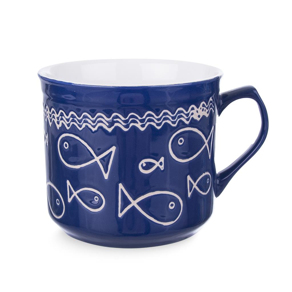 Odporučiť Veľký keramický hrnček s keramickým uchom na lepšie uchopenie s motívom RYBY je vhodný na servírovanie čaju, čokolády alebo iného teplého nápoja. Je zo série VARÁK vyrobený z keramiky. Objem: 0,5 l