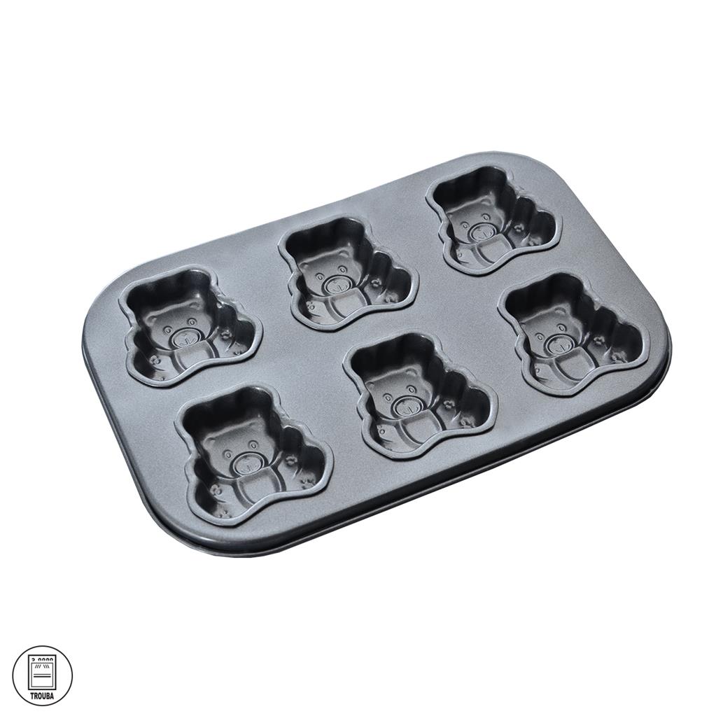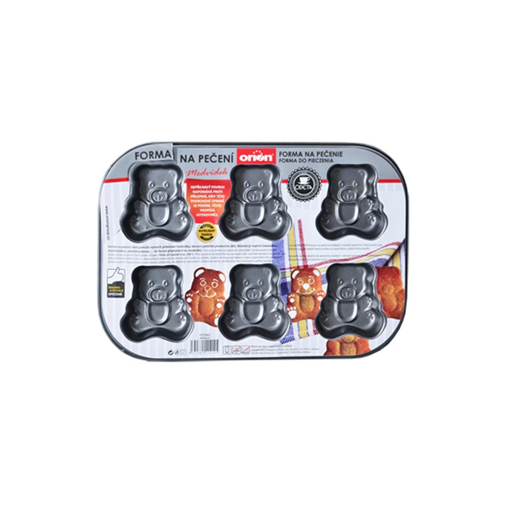 Kovová forma na pečenie medvedíkov, ktorými spravíte radosť najmä deťom. Naraz upečiete až 6 medvedíkov. Formu tiež môžete použiť na výrobu čokolády, piškót, marcipánu ale aj na výrobu mydielok či ľadu. Je vyrobená z moderného materiálu s nepriľnavým povrchom, vďaka ktorému sa cesto nepripaľuje.Taktiež nepreberá pachy z iných potravín a je hygienická. Materiál: kov s nepriľnavou vrstvou. Rozmery: 26,5×18,5×2,5 cm, veľkosť medvedíka 6×5,5 cm.