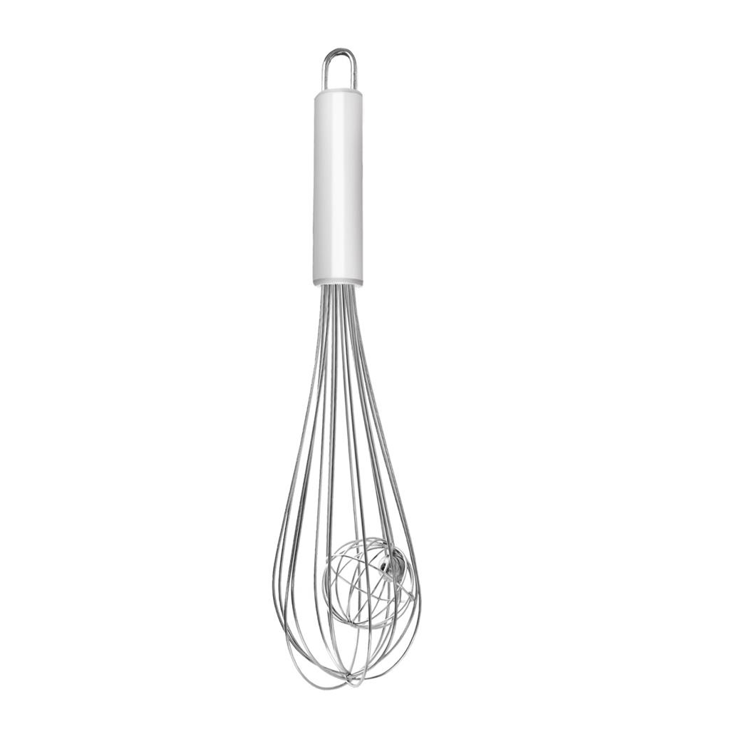 Metlička na šľahanie nerezová, je doplnená guľôčkami, ktoré výrazne zvýšia účinnosť a rýchlosť šľahania. Je vyrobená z veľmi kvalitného materiálu. Práca s ňou je rýchla a pohodlná. Zabezpečí to, že šľahaná hmota je omnoho viac prevzdušnená, ako pri klasickej metličke. Nemala by chýbať v žiadnej kuchyni. Vhodná do umývačky riadu. Rozmery: dĺžka 26,5 cm, priemer 6 cm.