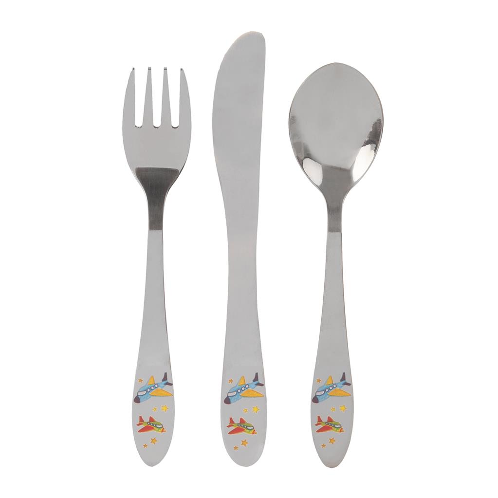 Detský príbor s farebným dekorom lietadiel pre chlapcov. Obsahuje 3 ks – lyžicu, vidličku a nôž. Materiál: kvalitný nerez. Tvar prispôsobený deťom. Ideálne pre prvé samostatné návyky stolovania. Umývanie v umývačke na riad sa neodporúča, aby nedošlo k porušeniu farebného dekóru, čo nemôže byť dôvodom na neskoršiu reklamáciu. Rozmery: lyžica 15,5 cm, vidlička 15,5cm, nôž 17 cm.