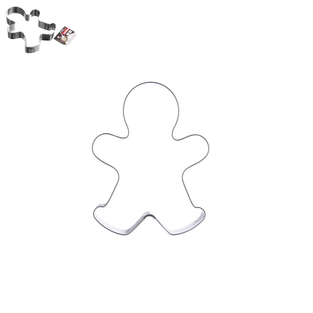 Nerezová vykrajovačka v tvare perníčka, vhodná na vykrajovanie perníka. Perníčky môžete vykrojiť tiež z fondánovej či marcipánovej hmoty, na ozdobenie torty. Formičku ľahko umyjete pod tečúcou vodou. Materiál: nerez. Rozmery: 7,5 x10x2 cm.