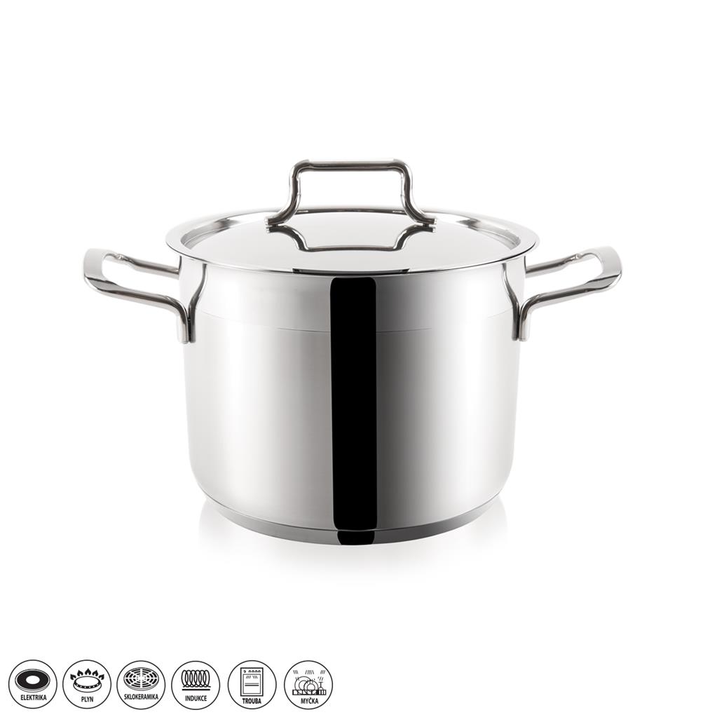 Nerezový kastról s pokrievkou s objemom 8,1l, priemerom 24cm a výškou 18cm. Výhodou nerezových kastrólov je ich technológia a kvalitné materiály, ktoré sú vhodné pre každú domácnosť a sú ideálnou cestou ku zdravej, diétnej, ekonomickej a estetickej príprave pokrmov. Kastról je vyrobený z naozaj vysoko kvalitnej nerezovej ocele. Tepelný zdroj treba vypnúť s predstihom, pretože naakumulovaná energia podá teplo ďalej do nádoby. Kastról je vhodný na všetky typy spotrebičov a môže sa použiť aj v rúre. Očistiť je ho možné aj v umývačke riadu. Nerezový kastról vám ponúka varenie bez tukov, bez straty vitamínov a minerálov obsiahnutých v potravinách. Zachová prirodzenú chuť jedla. Vonkajší aj vnútorný povrch kastróla je vysoko leštený, takže zabraňuje tomu aby sa na ňom usadzovali nečistoty a zaručuje dokonalú údržbu. Sendvičové dno s termoakumulačnými vlastnosťami zaručuje rýchle a ekonomické varenie s výraznou úsporou energie.