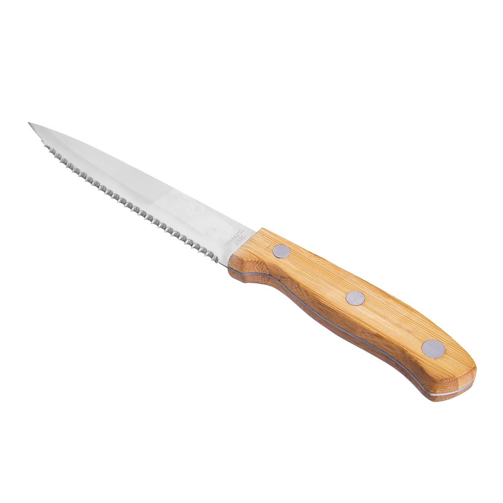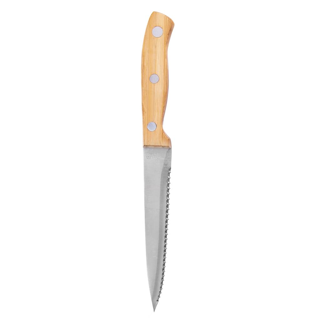 Nôž steakový je vyrobený z kvalitného nerezu a rúčka je doplnená bambusom. Jeho zúbkovaná čepeľ je si hravo poradí nielen so steakom ale aj s grilovaným mäsom.
