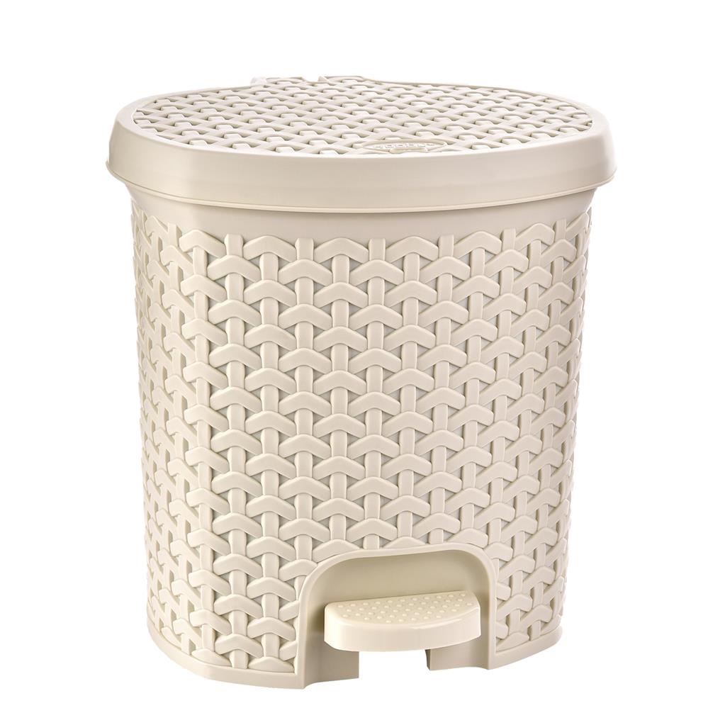 Plastový kôš na odpadky, na spodnej časti má umiestnený pedál na otváranie veka. Vo vnútri je vyberateľná plastová nádoba na odpadky. Je vyrobený z plastu v imitácii ratanu, vo viacerých farebných prevedeniach, je to assort farieb. Kôš vám pošleme podľa dostupnosti farby na sklade. Objem: 5,5 l.