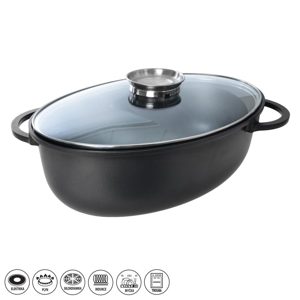 Hliníkový pekáč má rovnaké využitie ako klasický pekáč s vekom na prípravu mäsa v rúre a aj ako aróma pekáč. Nepriľnavý povrch Vám umožní prípravu jedál na minimálnom množstve tuku. Dá sa použiť pri všetkých zdrojoch vrátane indukcie vďaka špeciálnej úprave vonkajšieho povrchu. Do rúry ho možno vkladať s pokrievkou do max 200°C, bez pokrievky do max 260°C. Pekáč. Materiál: zliatina hliníka s dvojitou teflónovou vrstvou, sklenená pokrievka s nerezovým aróma lievikom. Rozmery: vnútorný 38x25x13 cm, vonkajší 43x30x13,5 cm, celková výška 20 cm. Výrobok je vhodný do úmývačky riadu a pri manipulácii s ním, odporúčame použiť kuchynské rukavice.
