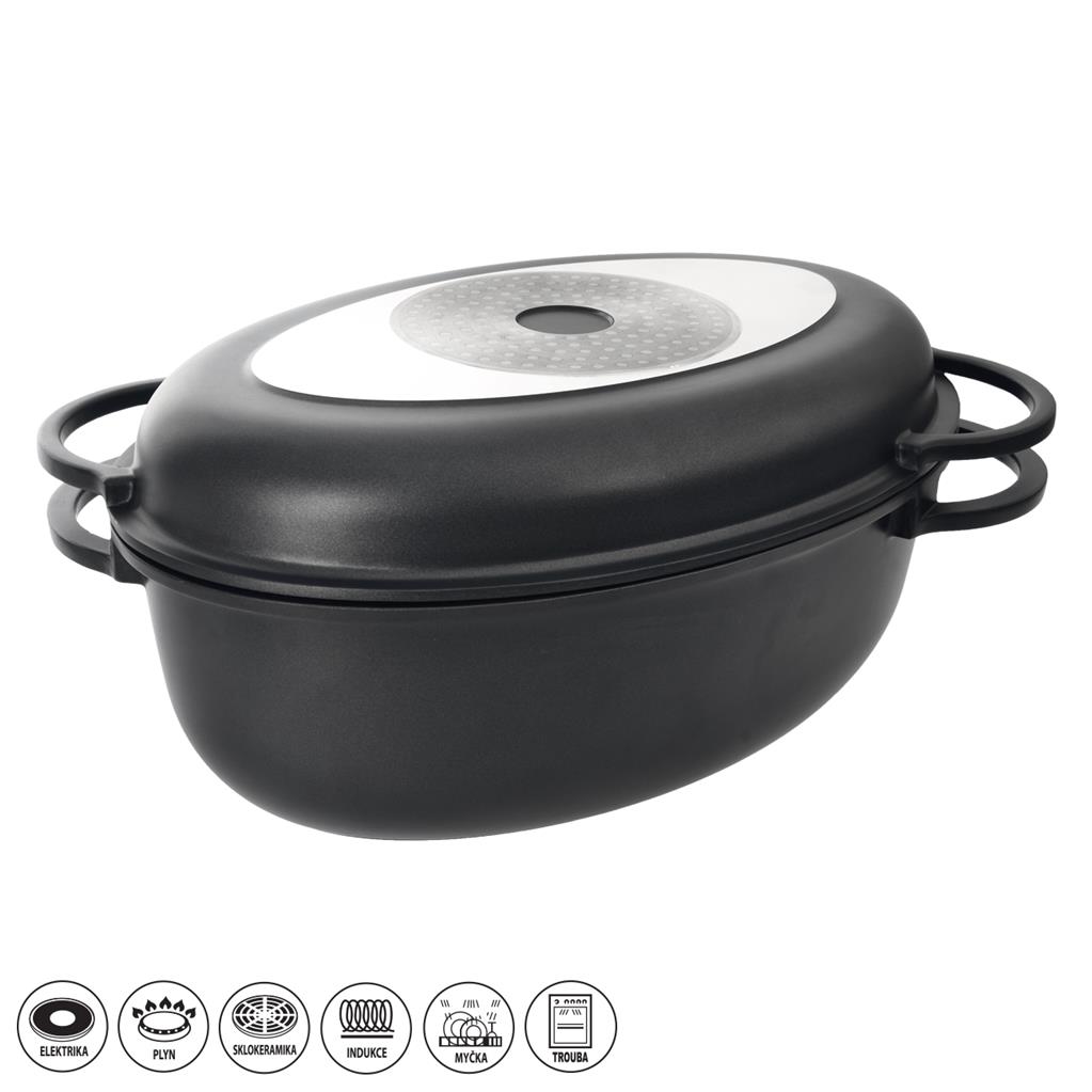 Hliníkový pekáč má rovnaké využitie ako klasický pekáč s vekom na prípravu mäsa v rúre a aj ako aróma pekáč. Oba diely sa dajú využiť samostatne. Spodný diel môžeme využiť na pečenie mäsa a horný diel ako nízky pekáč alebo panvicu na vyprážanie a pečenie. Nepriľnavý povrch Vám umožní prípravu jedál na minimálnom množstve tuku. Oba diely sa dajú použiť pri všetkých typoch tepelných zdrojov vrátane indukcie vďaka špeciálnej úprave vonkajšieho povrchu. Do rúry ho možno vkladať s pokrievkou do max 200°C, bez pokrievky do max 260°C. Pekáč. Materiál: zliatina hliníka s dvojitou teflónovou vrstvou, sklenená pokrievka s nerezovým aróma lievikom. Rozmery: horný diel – vnútorný 38x25x5 cm, vonkajší 43x30x5,5 cm, spodný diel – vnútorný 38x25x13 cm, vonkajší 43x30x13,5 cm, celková výška 20 cm. . Výrobok je vhodný do úmývačky riadu a pri manipulácii s ním, odporúčame použiť kuchynské rukavice.