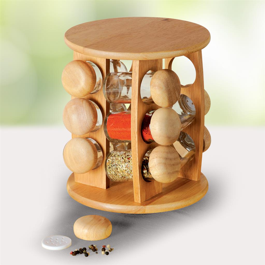 12 dielna súprava koreničiek je uložená v praktickom, otočnom, drevenom stojane. Koreničky sa veľmi ľahko vyberajú a po použití pohodlne ukladajú do otočného stojana. Sklenené koreničky majú plastové násypníky a uzávery z tvrdého dreva. Objem koreničky je 80 ml. Rozmer stojanu: priemer 20 cm, výška 24 cm. Materiál: tvrdé drevo.