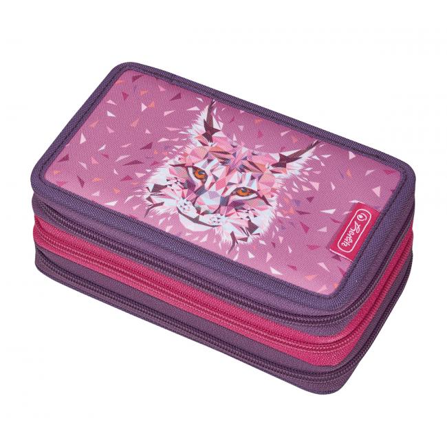 Peračník Herlitz 3 zipsový, plný, Wild Animals Rys, 3 – poschodový. Výbava obsahuje 31 predmetov: 14 fixiek, 8 farbičiek, 2 ceruzky, strúhadlo, gumu, pravítko s dĺžkou 16cm, trojuholníkové pravítko, uhlomer, pravítko – šablónu, guľôčkové pero – všetko čo malý školák bude denno-denne využívať. Svojou farebnosťou je určený pre dievčatá. Praktické rozmery a jednoduchá manipulácia uľahčí život v škole vašej ratolesti. Materiál: polyester. Rozmery: 19 x 11,5 x 7 cm.