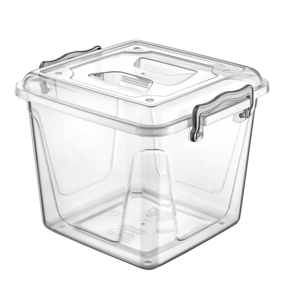 Plastový box štvorcový, transparentný, nízky s možnosťou širokého využitia vo vašej domácnosti. Je vhodný na uloženie potravín, hračiek aj oblečenia. Po bokoch sú plastové klipsy na pevné uzatváranie viečka a preto je obsah v boxe chránený pred prachom a inými nečistotami. Objem: 8,5 litra
