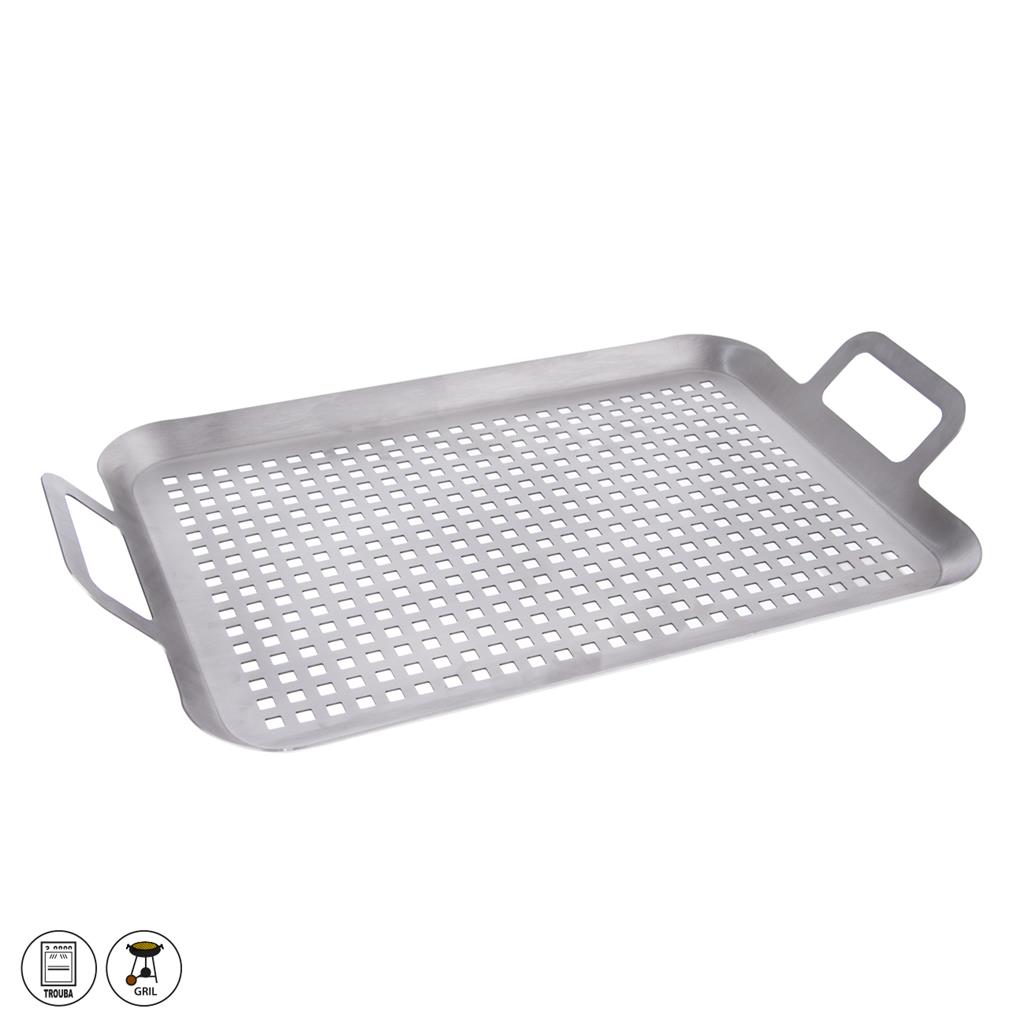 Ak si želáte ugrilovať pochúťku z mäsa, rýb, špízov na grile alebo v rúre, použite grilovací plech. Na priamom ohni, v rúre alebo na grile sa pokrm pripravuje veľmi jednoducho, keďže cez otvory v plechu preniká teplo a žiara. Vďaka dvom úchytom sa jednoducho prenáša a ľahko ho odstavíte z ohňa či vyberiete z rúry – nezabudnite použiť kuchynské chňapky alebo rukavice. Materiál: nerez. Je vhodný do umývačky na riad. Rozmery: 43x25x1,5/5 cm