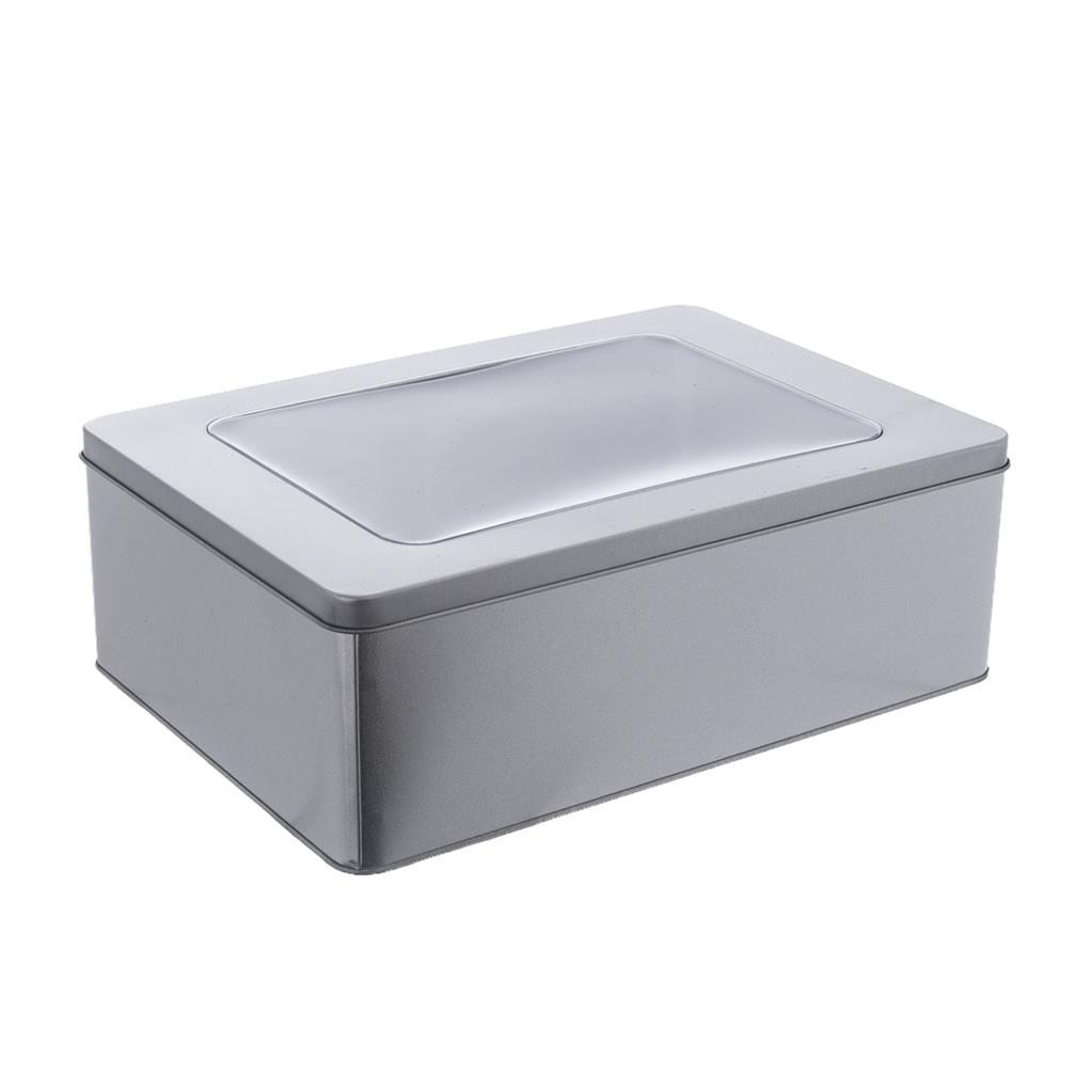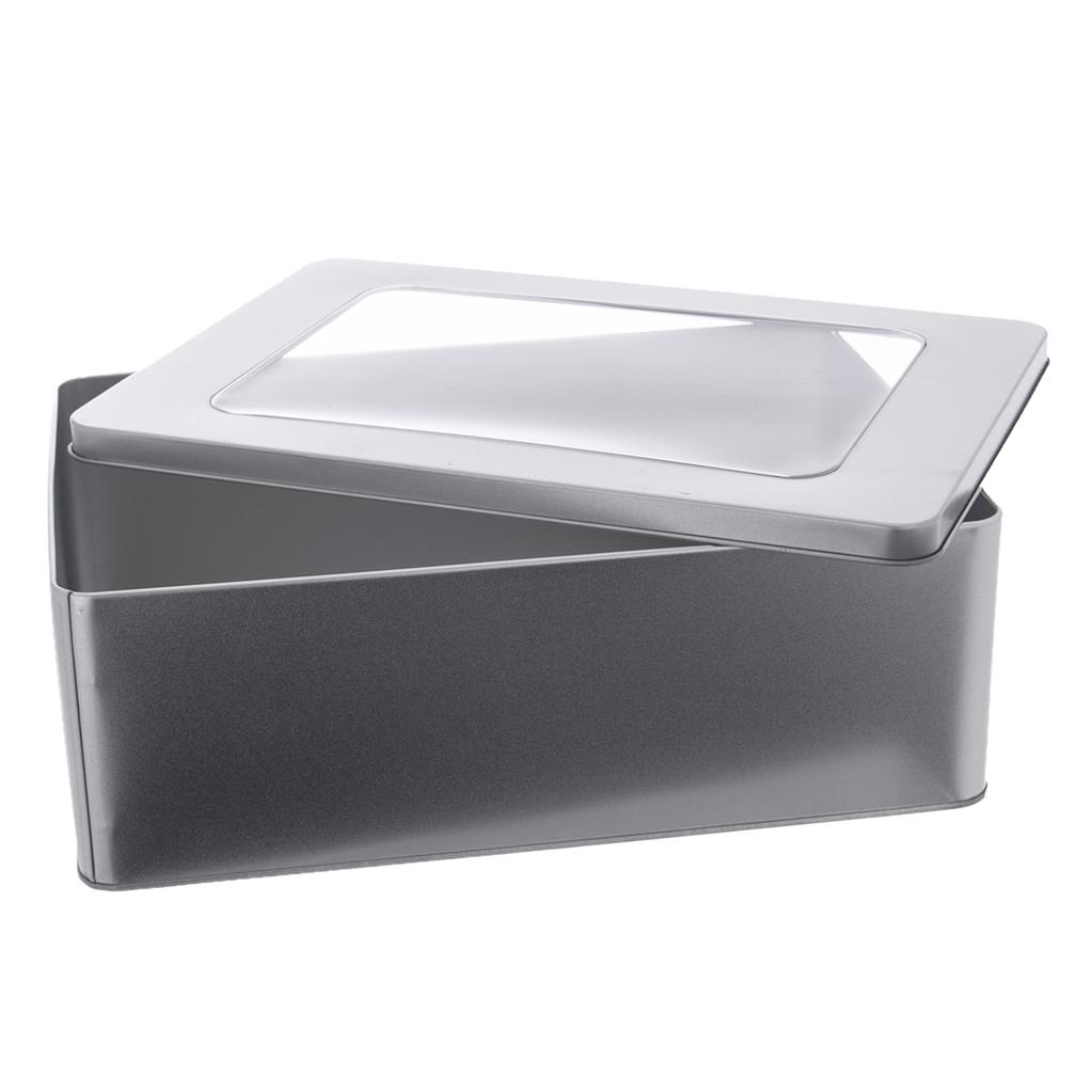 Elegantná hranatá kovová dóza s priehľadným okienkom z plastu na viečku 27x19x9 cm.