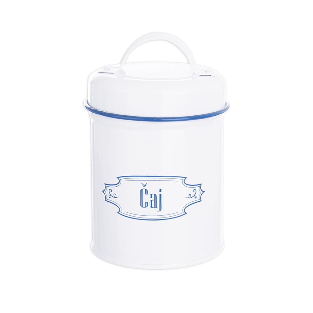 Guľatá plechová dóza s viečkom na uloženie čaju BLUE LINE 9×15,5 cm, pre milovníkov retro štýlu.