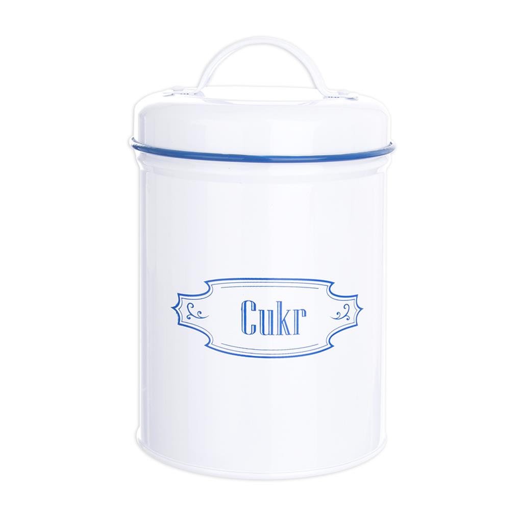 Guľatá plechová dóza s viečkom na praktické uloženie cukru BLUE LINE 11×18,5 cm, pre milovníkov retro štýlu.