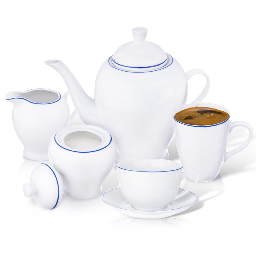 Porcelánová mliekovka s modrou linkou. Pre milovníkov retro štýlu, ozvláštni rodinné stretnutie aj posedenie s priateľmi. Rozmery: 0,35 l, 8×10 cm.
