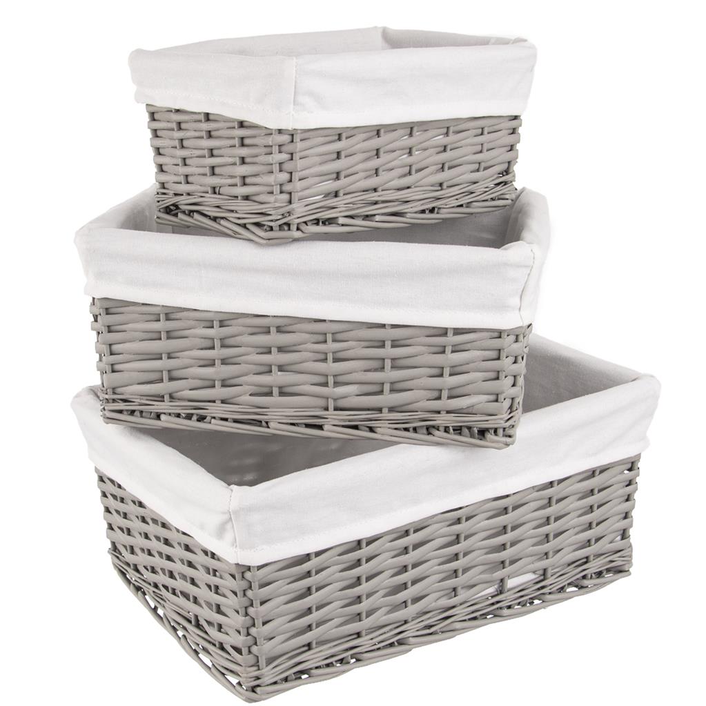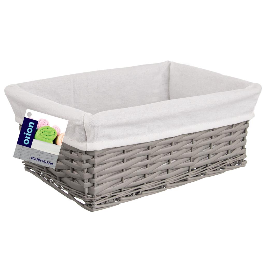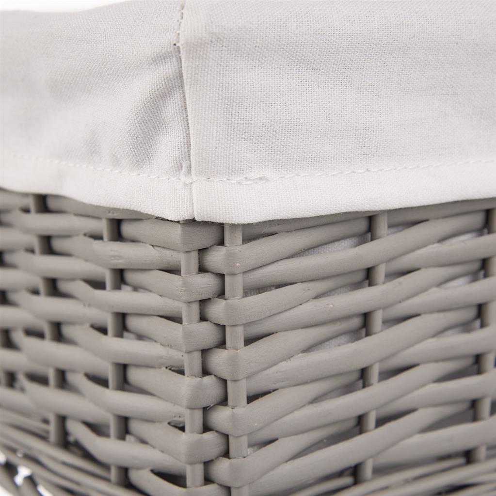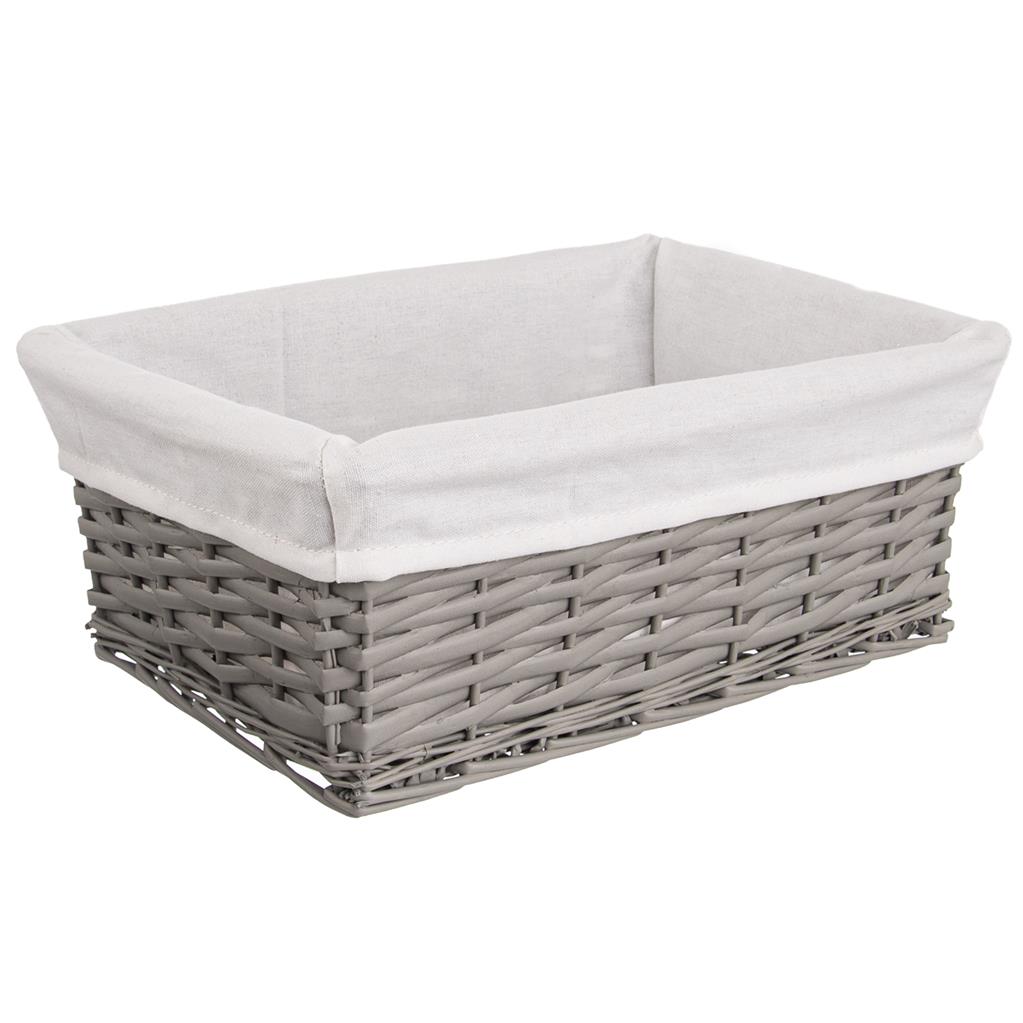 Prútený košík v šedej farbe je potiahnutý bavlnenou látkou. Môžete ho využiť na uloženie drobnej bielizne a iných drobností. Je skvelým doplnkom v štýlovej kuchyni alebo na chate. Textília vo vnútri je odnímateľná, možnosť prať v práčke. Materiál: vrbové prútie, textília – 65% bavlna, 35 % polyester.