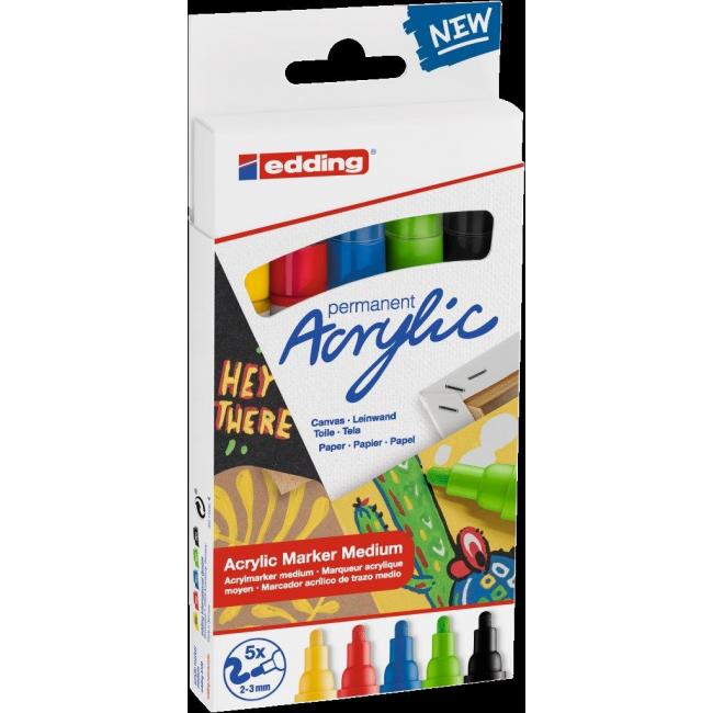 Sada akrylových popisovačov edding 5100, 5 f, základné farby, vhodných na svetlé aj tmavé povrchy so šírkou stopy 2 – 3 mm. Farba: mix, počet: 5 kusov.