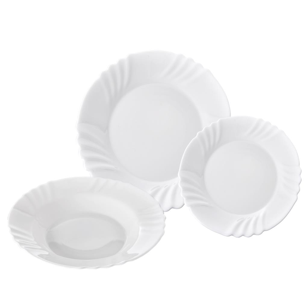 Sada tanierov 18 kusov, taniere majú guľatý tvar. Materiál: opálové sklo. Jednoduchá ale vkusná sada tanierov do každej domácnosti. Rozmery: 6x dezertný pr. 20 cm, 6x hlboký pr. 24 cm, 6x plytký pr. 25,5 cm.
