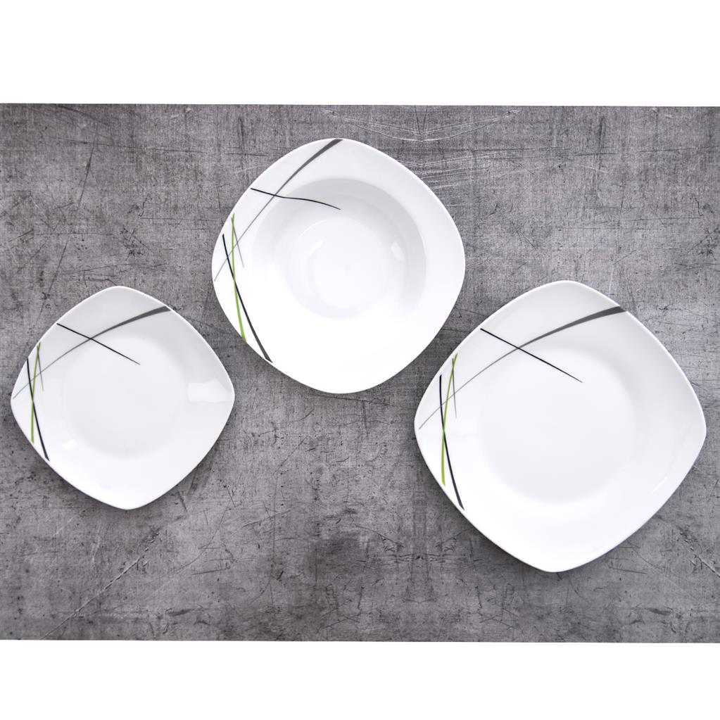 Jedálenská porcelánová súprava obsahuje 18 kusov – 6 x tanier dezertný, 6 x tanier hlboký a 6 x tanier plytký. Taniere majú hranatý tvar a jemný dekór.
