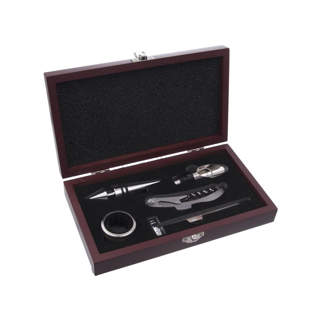 Sada na víno v krabičke je výborným darčekom nielen pre mužov. Obsahuje otvárač na víno s nožíkom, krúžok na servítku, ozdobnú zátku na fľašu, nálievku a teplomer.