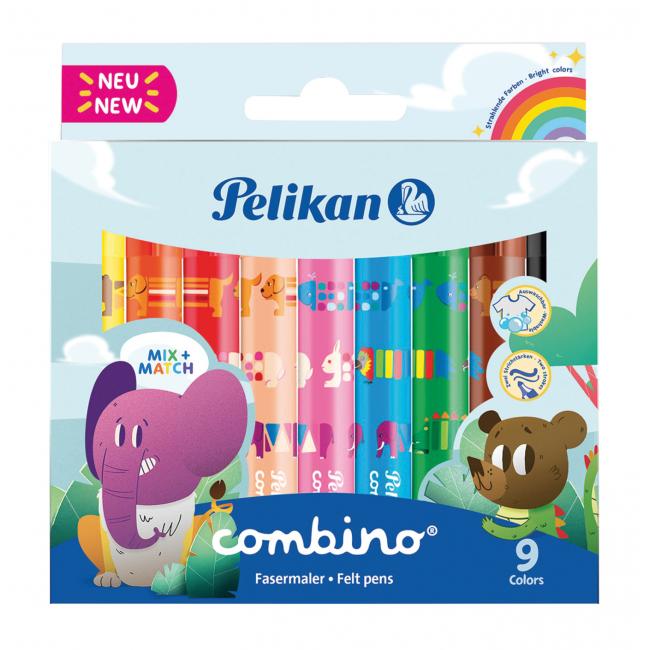 Sada popisovačov Pelikan Combino 411, 9 farieb. Popisovače s väčšou hrúbkou modelu Combino s kombinovateľným zvieracím motívom.