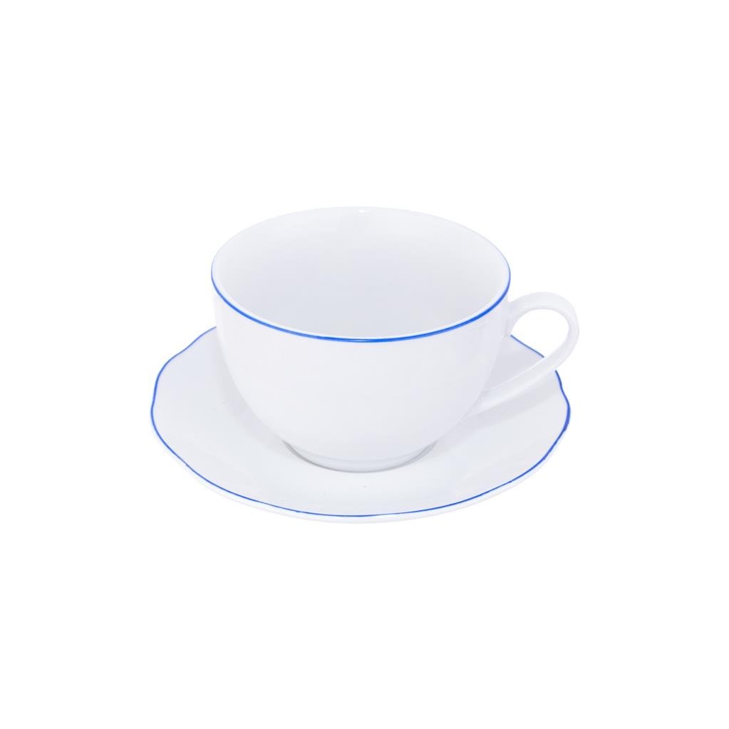 Porcelánová šálka s modrou linkou. Krásny set nielen pre milovníkov retro štýlu, ozvláštni rodinné stretnutie aj posedenie s priateľmi. Rozmery: 0,28 l, 9×6 cm, podšálka pr. 14cm.