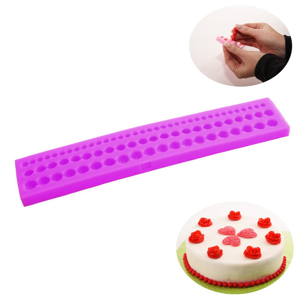 Vysoko kvalitná silikónová forma je výborným pomocníkom pre každú cukrárku. Použiť ju môžete pri zdobení torty alebo pri výrobe želé cukríkov či čokolády. Vytvoríte s ňou až 3 rôzne druhy perličiek. Ľahko sa umýva pod tečúcou vodou, ale je vhodná aj do umývačky riadu. Materiál: silikón. Rozmery: priemer perličiek 1cm/0,9cm/0,6cm. Forma 23x4x1,5 cm.